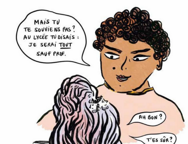 Critique : Cet album est un roman graphique léger, où il n’y a pas de traumatisme enfoui, de blessures de l’âme. Il s’agit d’une autobiographie de moments choisis qui, sans être forcément fondateurs, proposent un regard évanescent, tranquille et lucide sur une profession. Ce n’est pas une plongée en eaux troubles, mais plus le glissement dans les eaux chaudes d’une source paisible. L’autrice raconte son métier non pas comme une vocation, mais bien une suite de sentiments : l’imposture tout d’abord, l’espoir, la tendresse, un peu de colère aussi. Ce qui revient, ce qui imprègne, c’est ce lien avec les élèves, un fil fin, souvent distendu, mais terriblement précieux, fait de petites bribes sans importance qui s’entremêlent. Et alors on ne voit plus que cela, même si la frousse, l’envie de tout arrêter, la critique des absurdités du système, affleurent également dans cette autobiographie qui dit des choses vraies.