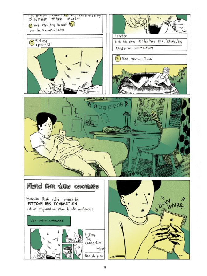 Le fond est donc assumé et profond, mais la forme n’est pas en reste. Les planches s’ enchaînent avec quelques effets, le flou pour une soirée arrosée, les messages privés en premier plan, une double page très West Side Story (ou Les Aristochats selon les références), mais là n’est pas la grande originalité. Le choix des couleurs pour les humeurs ou le temps qui passe, ou encore ces lignes très courbées pour soigner les corps et déchirer les cœurs, c’est plutôt là que l’on sent battre le coeur de l’album, qui ne dérape jamais alors que le héros s’écarte, mais tout est si familier pour le féminin de notre réalité que rien ne semble faux ou exagéré, et le dessin y est pour beaucoup.