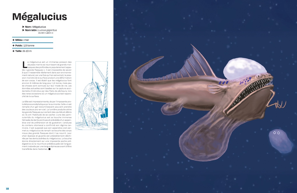 Ces textes sont accompagnés par de très belles illustrations en couleurs réalisées sur un ordinateur par Léo. Elles peuvent surprendre, car ce style de dessins est tout à fait différent de celui qu’il utilise dans sa série. Cependant, ces illustrations souvent en pleine page apportent à ce bestiaire une touche d’élégance supplémentaire et accentuent un peu plus le vrai semblant scientifique de l’ouvrage. La combinaison des textes, croquis et illustration donnent un ouvrage complétement bluffant et habilement trompeur !