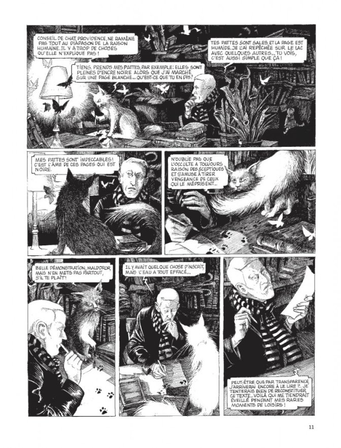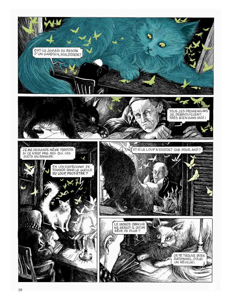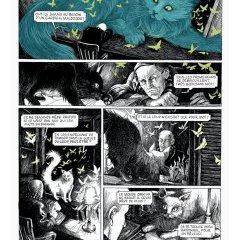 Critique : Certains livres, à l’instar de certains films, non seulement méritent, mais doivent être relus. Cette relecture permet de mieux cerner les qualités, apprécier l’originalité, saisir la nuance, et relire Le bestiaire du crépuscule fait indubitablement cet effet, à savoir que l’on se dit que l’on a manqué trop de choses en la lisant trop rapidement la première fois. Trouver une qualité de poésie, comme si les dialogues avaient été écrits par ces auteurs romantiques, Daria Schmitt se mutant en Musset pour faire dire à ses personnages de belles métaphores sur la vie, puis en tombant dans le théâtre de l’absurde, jouant du Beckett avec une parodie de libéralisation du parc par une directrice qui n’est pas à un contresens près. Apprécier l’originalité de cet ouvrage, qui s’appuie sur une nouvelle de Lovecraft intégralement recopiée à la fin, que l’on a plaisir à lire (rassurez-vous, ce n’est pas une qui fait trop froid dans le dos), et la ramifie, lui donne de l’ampleur et de la vigueur, comme si elle avait été écrite seulement pour permettre cette œuvre graphique.