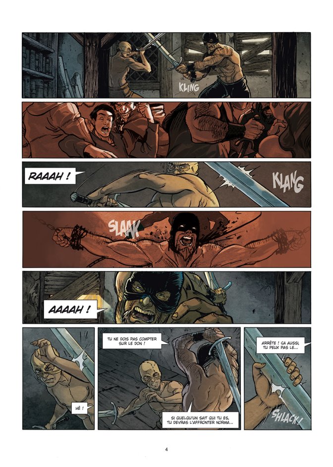 Côté dessin, l’empreinte de Julien Carette est bien posée sur cette série, avec un Moyen-Âge sombre à souhait, des rues insalubres, mais aussi par exemple des hommes du peuple affublés de leurs couvre chefs immondes pour nos codes de mode mais qui étaient répandus et indispensables à l’époque. Les couleurs sont toujours fades, car elles étaient réservées aux nobles, les murs crasseux, mais c’est un bon rendu historique, qui renforce ce côté fantastique, puisque tout le cadre concorde. A noter que les visages ne sont pas particulièrement détaillés, la faute à l’histoire qui privilégie l’anonymat ces protagonistes principaux.
