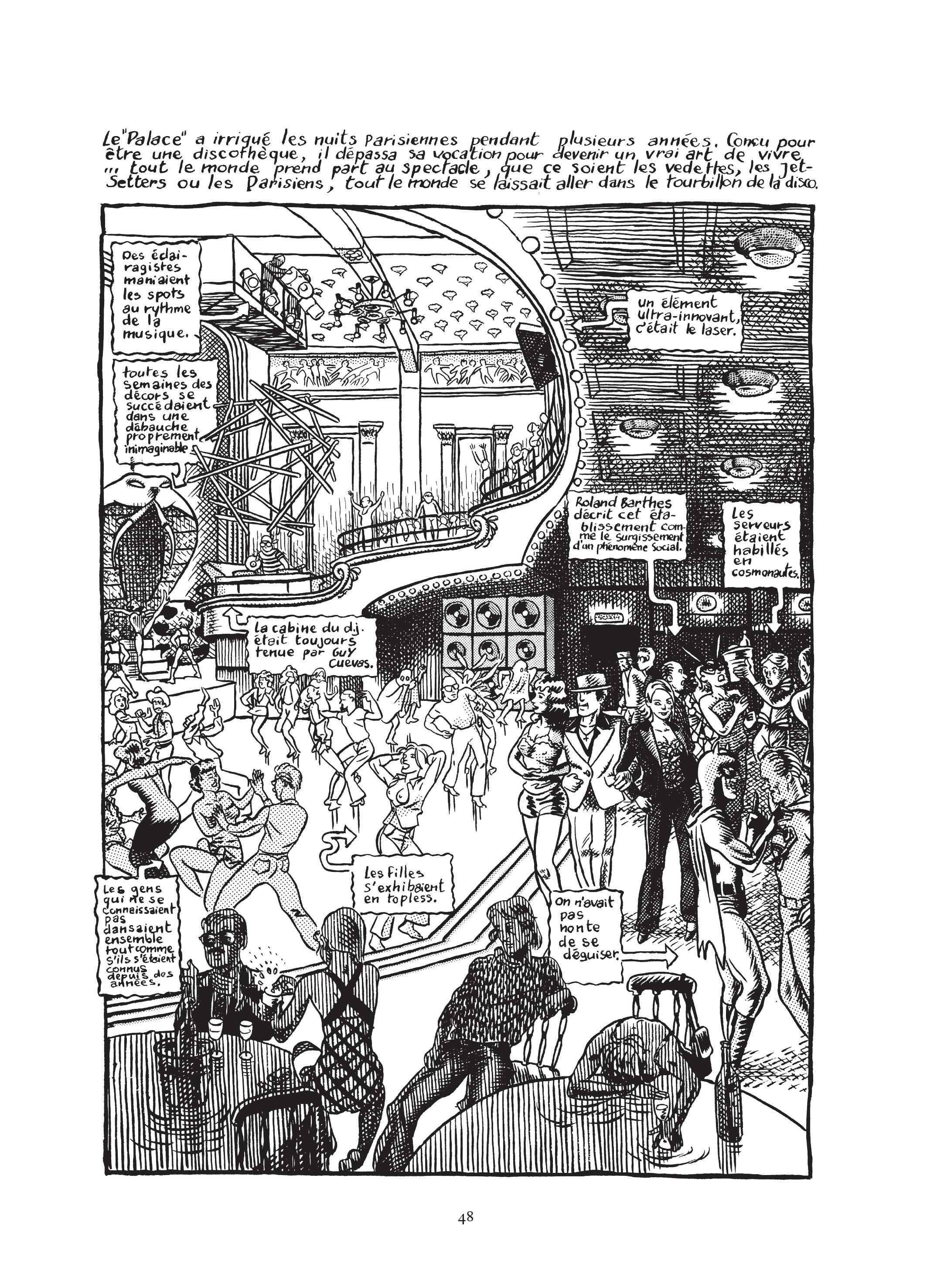 Chaque intervention de la voix de l’auteur est dessinée d’une manière spécifique allant jusqu’à des pleines pages très travaillées qui dépeignent les stéréotypes disco de l’époque. On admire le travail des pochettes d’album, de l’ambiance des boites de nuits et des grandes icônes musicales.