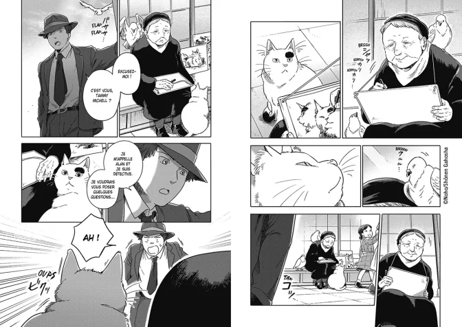 On retrouve les classiques du style manga, avec un encrage très fin, le noir et blanc intégral, ponctué par l’emploi de trames de gris qui marquent principalement les ombres. La composition des planches va dans le sens de la narration : on suit parfois le chat dans ses marches sur plusieurs cases, sans dialogues. Noho prend le temps de laisser vivre son héros. En effet, le chat est le héros de ce récit, mais pas le protagoniste, car on ignore tout de ses conflits. Paradoxalement, le chat est témoin, et les vrais protagonistes sont les personnages dont il croise la route et dont nous découvrons, le temps d’une histoire de quelques pages, les problèmes, les attentes, les angoisses. Et mine de rien, on s’attache à ce bon gros matou blanc qui nous mène de récit en récit.