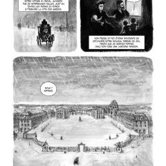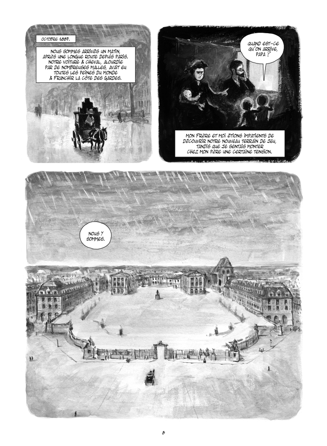 Outre son sujet passionnant et un choix graphique judicieux, la réussite du Château de mon père repose également sur la pertinence de ses parti-pris narratifs. Les auteurs entremêlent l’histoire de Versailles et le progressif délitement de la famille de Nolhac qui réside dans le château. Et c’est le fils de Pierre de Nolhac, Henri, qui porte la narration de l’album. L’album gagne en souffle dramatique et contourne de cette manière le danger de l’exposé historique fastidieux. Le dossier historique de fin d’album, richement illustré, complète utilement les informations données par le récit.