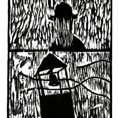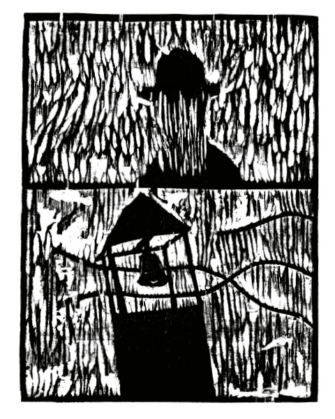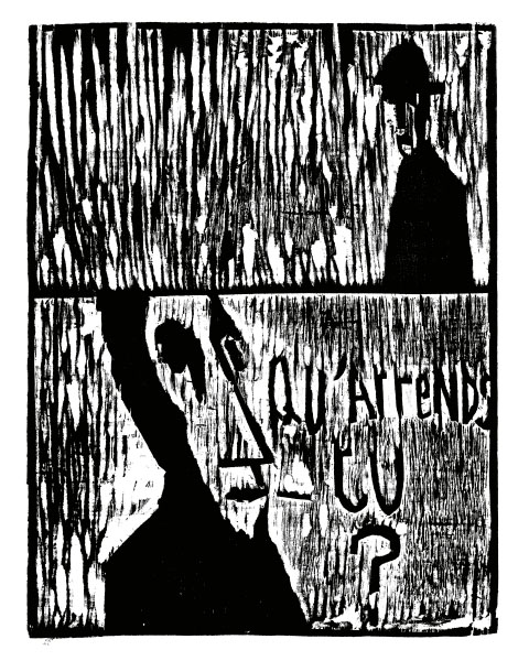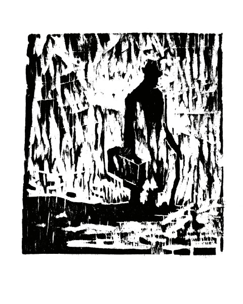 « Le matériau s’est imposé […] grâce aux noirs vibrants qu’il suggère ». La technique graphique rappelle la tradition de la gravure belge dont Olivier Deprez s’est beaucoup inspiré. Mais là encore l’auteur détourne, il recrée. Le bois est malmené, griffé, déchiré. Des interventions très physiques qui n’excluent pas des hasards étonnants de précision et de présence.