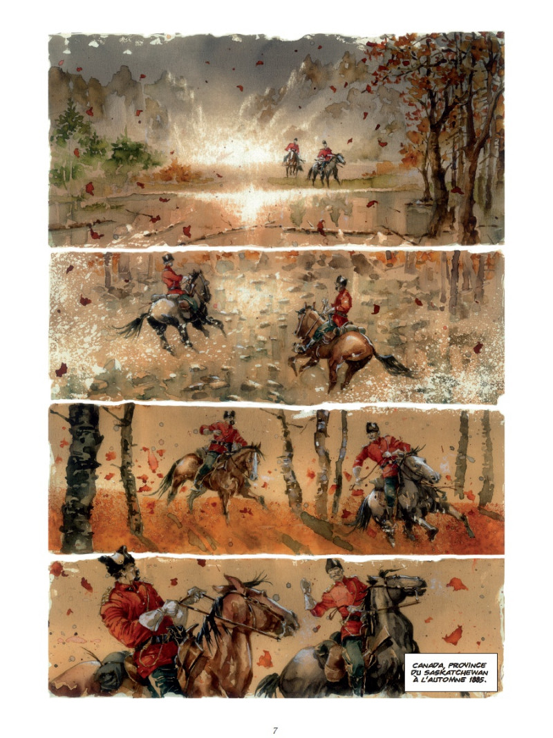 Le Chemin du Couchant nous ramène en 1885 en pleine province du Saskatchewan au Canada. Deux officiers traquent un homme mais la poursuite prend une autre tournure quand les deux soldats pensent avoir logés leur proie...