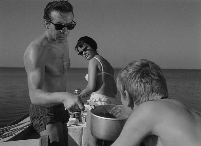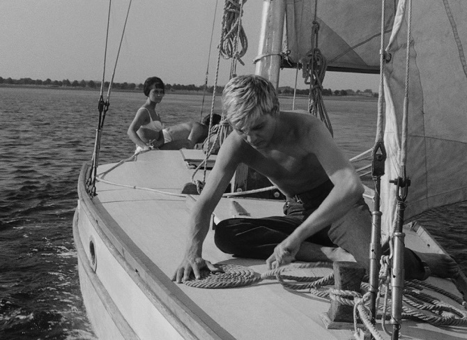 Critique : Le couteau dans l’eau est le premier long métrage de Roman Polanski, et l’unique qu’il ait tourné dans sa Pologne natale, si l’on excepte la coproduction Le pianiste, palme d’or à Cannes en 2002. Diplômé de l’école de cinéma de Łódź, Polanski avait réalisé plusieurs courts métrages, dont deux sont de véritables chefs-d’œuvre, à savoir Deux hommes et une armoire (Dwaj Ludzie z Szafą – 1958 – N&B – 15 mn) et Quand les anges tombent (Gdy spadają anioły – 1959 – N&B et Couleurs – 22 mn). Coécrit avec deux scénaristes dont Jerzy Skolimowski (futur réalisateur de Deep End), le script du Couteau dans l’eau fut refusé par le ministère de la culture du gouvernement polonais. Ce n’est qu’après avoir obtenu la recommandation du réalisateur et professeur de cinéma Jerzy Bossak (1910-1989), et accepté de d’ajouter un pseudo-argument social au film, que Polanski put entreprendre le tournage. Celui-ci eut lieu avec la méfiance des autorités, qui demandèrent de remplacer la Mercedes du couple central par une Peugeot 404, moins luxueuse et davantage politiquement correcte, conformément aux codes du réalisme socialiste. Car le cinéma polonais de l’époque, comme celui des autres pays de l’Est, baignait dans cette doxa, en dépit de l’originalité thématique et esthétique de grands auteurs tel Andrzej Wajda. La trame du Couteau dans l’eau peut faire songer au début de La dame de Shanghai d’Orson Welles ou à l’intrigue de Plein soleil de René Clément : une croisière avec un couple et un autre homme, une ambiance oppressante dans un cadre conflictuel, des rapports de manipulation… Polanski s’approprie ce matériau en concoctant un récit épuré respectant les unités de temps, de lieu et d’action, et comportant uniquement trois personnages : on songe aux futurs castings minimalistes de La jeune fille et la mort, Carnage ou La Vénus à la fourrure. Les dialogues et la narration se présentent d’emblée comme une critique implicite du pouvoir en place. Andrzej, l’homme mûr, propriétaire de la voiture et du yacht, représente cette « bourgeoisie rouge » arrogante et ancrée dans ses privilèges, à l’instar des membres de la nomenklatura soviétique. Il n’est certes que journaliste sportif (du moins c’est ce qu’il affirme), mais ses signes extérieurs de richesse laissent penser qu’il a un statut plus important.