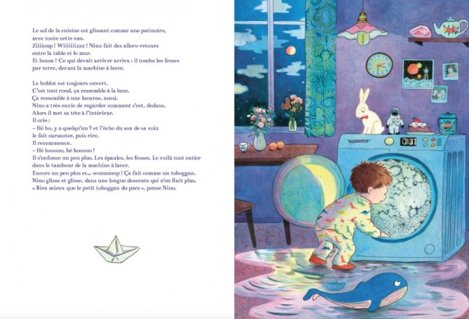 Elle illustre avec justesse les prolongements qui s’opèrent entre le monde du jour, réel, et celui de la nuit, fantastique, le second interrogeant et sondant le premier. En effet, lorsque Nino se réveille, un mystère plane dans l’appartement : ses parents sont étrangement silencieux, et les pièces baignent dans une atmosphère étrange qui rompt avec les habituels réveils du petit garçon. Celui-ci comprend alors que quelque chose se passe, sans véritablement savoir quoi, et cette forte impression agît directement sur son inconscient. Le rêve ne débute-t-il pas dans cette fameuse cuisine où il découvrit son père éponger le sol ? Les auteurs racontent ainsi l’hypersensibilité des enfants, en offrant une explication à cette aura mystérieuse qui a tant perturbé le garçon, à travers une pirouette narrative des plus réjouissantes : le « dégât des eaux », annoncé dans le titre, gaiement prononcé par le père de Nino et que le garçon (en même temps que le lecteur) imputait à une fuite de la machine-à-laver, n’était autre que l’épanchement du liquide amniotique de la mère dont le travail venait de commencer, au moment où Nino retrouvait ses parents dans la cuisine.