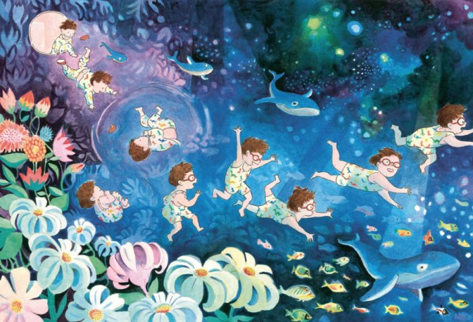 Les images de Camille Jourdy sont particulièrement belles et incarnent merveilleusement bien ce conte fantastique. La dessinatrice use de couleurs chatoyantes, qui lui permettent de mettre en image la bienveillance prodigieuse qui anime ces panoramas oniriques. Préservant une gamme pastel, elle installe une douceur singulière qui retranscrit de sublimes ambiances nocturnes et aquatiques au sein de très belles doubles pages. Plus encore, Camille Jourdy fait preuve d’une grande générosité graphique, en dissimulant dans ses images une myriade de détails désopilants, de saynètes absurdes et de personnages pour le moins comiques, qui deviennent rapidement un prétexte à amusement. On se laisse ainsi déporter du fil narratif de l’histoire avec gourmandise, pour découvrir et se délecter de tous les trésors que recèlent ces grandes illustrations.