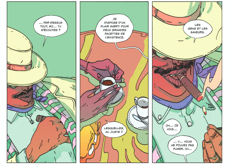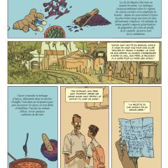Sur le plan graphique, Filipe Andrade livre une prestation dans la continuité de Toutes les morts de Laïla Starr, avec des aplats de couleurs vives et un trait fin qui privilégie l’esquisse de ses personnages au détails – ce qui donne à ses planches un caractère faussement brouillon – mais dont les compositions s’avèrent particulièrement bien travaillées, et dotées d’un réel dynamisme. On est séduit par la reconstitution des marchés et des terrasses, où on a envie de s’asseoir avec les protagonistes pour boire un masala chaï. La traque qui traverse la narration donne le rythme d’un récit parfaitement maîtrisé de bout en bout, et dont on ressort le ventre gargouillant.