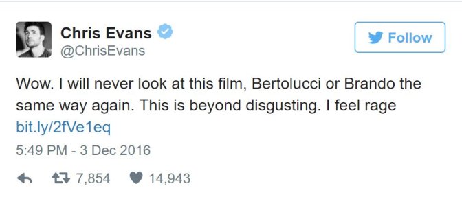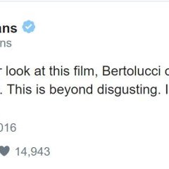 Confirmée depuis par Bertolucci, lors d’une rencontre avec le public de la Cinémathèque, l’information éclate au grand jour d’Hollywood qui exprime son dégoût sur les réseaux sociaux. De Chris Evans à Jessica Chastain, en passant par Anna Kendrick, le dégoût est sur toutes les lèvres.