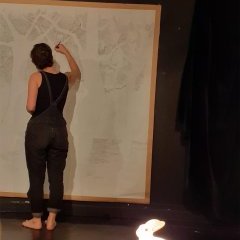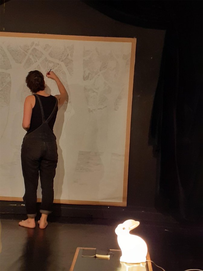Le spectacle s’ouvre sur une voix off, alors que la salle est encore plongée dans le noir : c’est la voix de celle qui est toujours là, quelque part, omniprésente. Quand les projecteurs s’allument, le spectateur découvre un grand panneau blanc sur lequel sont dessinés des arbres en devenir, juste esquissés. La comédienne y portera sobrement et délicatement de simples hachures grises, tout au long du spectacle, comme pour apaiser peut-être ses pensées délétères ou au contraire pour ne pas se laisser envahir par une seule d’entre elles...