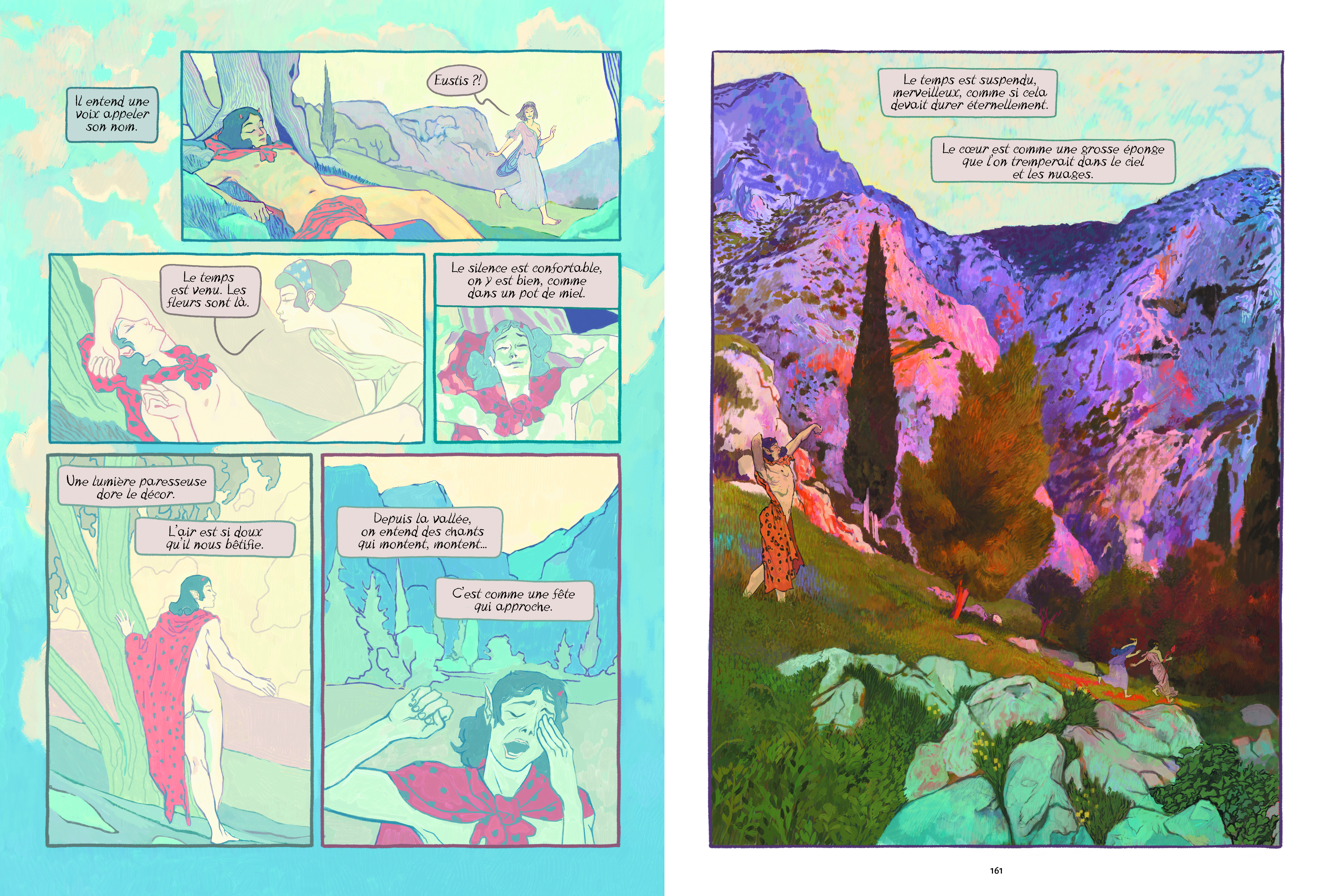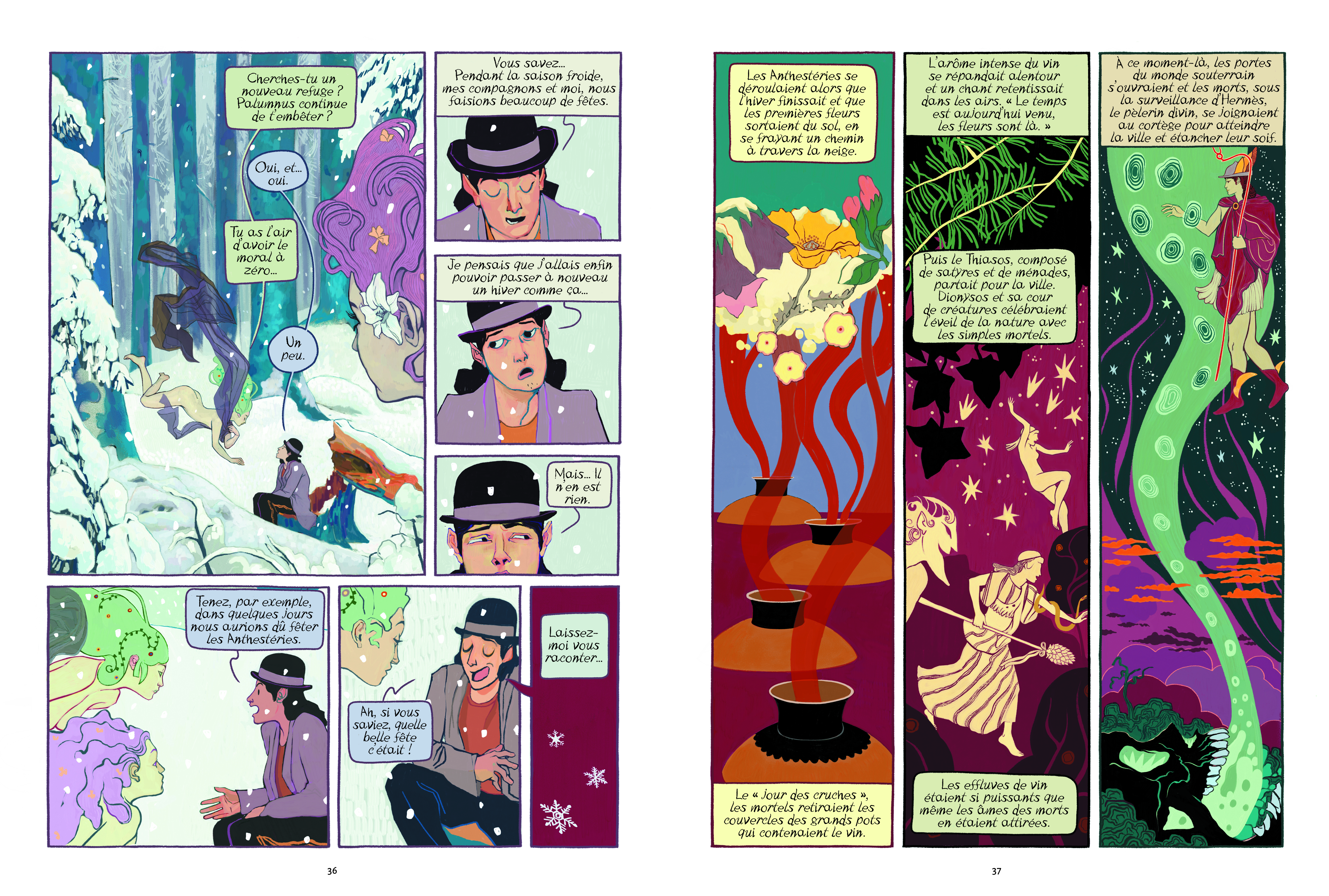 Les planches, réalisées sur tablette graphique, présentent un dégradé saisissant et poétiques de couleurs : en quelques traits, Dori nous fait basculer du monde réel – ses immeubles, ses voitures, ses maisons individuelles… – au monde du mythe, avec ses temples, ses créatures étranges, ses paysages irréels. Le dessinateur puise son inspiration dans l’Art Nouveau pour créer ses fées et autres divinités qui officient dans des paysages colorés. On sent également d’autres influences, parmi lesquelles Mondrian pour la scène dans l’usine. Ce travail graphique, d’une qualité exceptionnelle, témoigne de l’imaginaire foisonnant de Fabrizio Dori. On s’arrête avec délice sur les détails de certaines planches pour savourer ici un paysage, là un dégradé de couleurs.