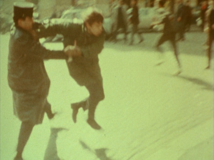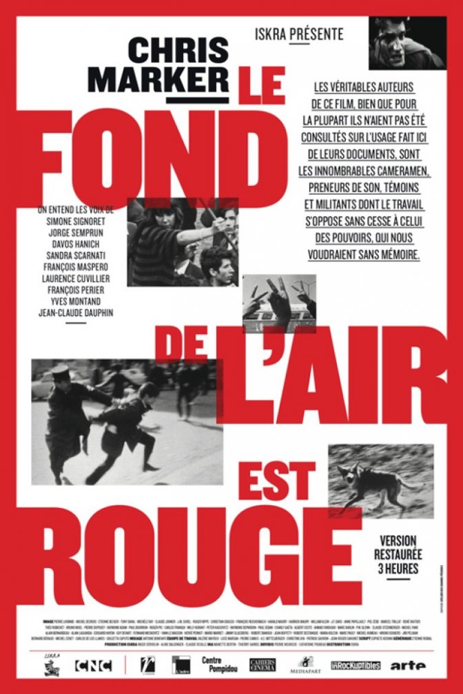 Marker débute un long travail de montage à partir de bobines datant de la fin des années 60, qui déjà reflètent les prémices d’une contestation planétaire qui atteindra son apogée en 1968 et par la suite sera étouffée par leurs gouvernements. En 1977, d’une durée initiale de 4 heures, Le fond de l’air est rouge sort en salle. Marker nous propose un film militant qui n’est ni un documentaire, ni une fiction, une œuvre aspirant à une analyse politique. Il est découpé en deux parties : Les mains coupées « Du Viet-nam à la mort du Che & Mai 68 et tout ça… », montrant les espoirs de la gauche à travers différents pays tels que le Vietnam, Cuba, la Bolivie, la France… et Les mains coupées, comme son nom nous l’indique, l’échec des révolutions et la reprise en main par un pouvoir conservateur « Du printemps de Prague au programme commun & Du Chili à – quoi, au fait ? ».