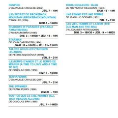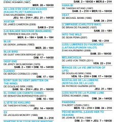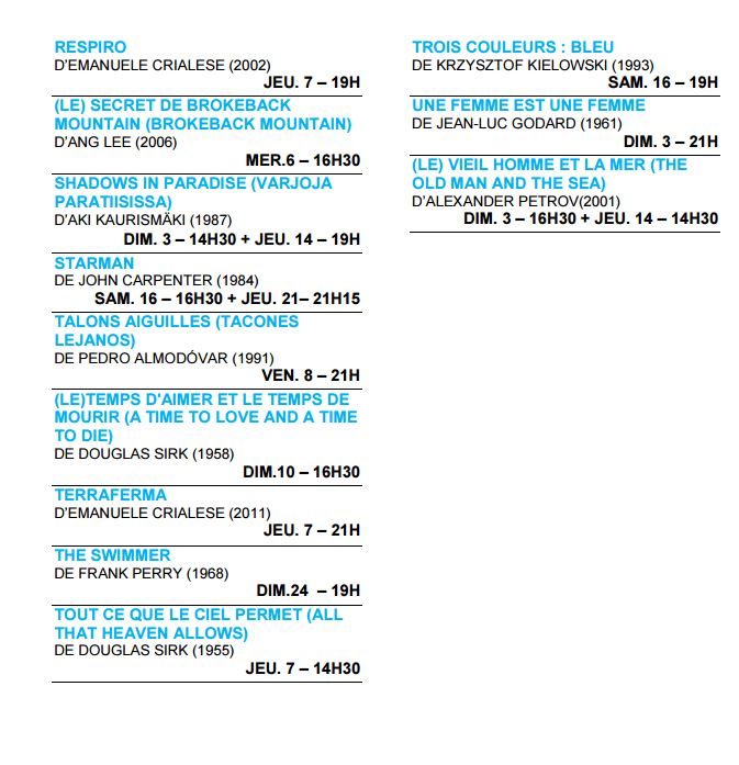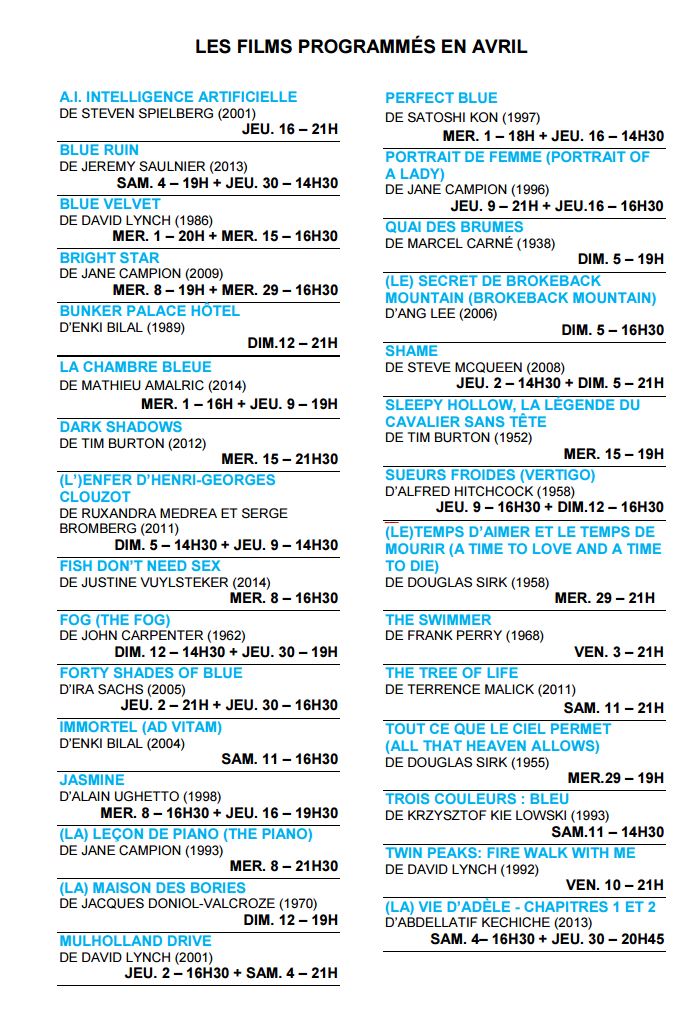De Blue Velvet au segment Bleu de la trilogie de Kieslowski, à La Vie d’Adèle (adaptation de la BD Le bleu est une couleur chaude), le bleu a inspiré les programmateurs du Forum de souvenirs vaporeux (la brume épaisse du Fog de Carpenter), aqueux (les baignades siciliennes de Respiro), cliniques (A.I).