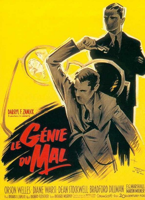 Il n’hésite pas, entre autres défis, à chercher à lui faire écraser un ivrogne ou abuser d’une étudiante (Diane Varsi, pourtant aussi bienveillante que dans Johnny s’en va-t-en-guerre). L’œuvre excelle à dépeindre le malaise d’une société américaine dont les enfants les mieux lotis ne sont pas eux-mêmes à l’abri des pires intentions, malgré le contrôle social exercé par les biens-pensants, à l’image du frère (Richard Anderson), qui tente en vain de détourner Judd de son et ses démon(s). On admirera la sobriété de la mise en scène, une ellipse évacuant le meurtre du jeune adolescent dont le corps meurtri sera hors-champ à la séquence suivante. On peut penser que ce n’est pas seulement une contrainte d’autocensure lié au Code Hays encore en vigueur à l’époque, mais aussi une question d’élégance filmique, loin de la surenchère gore d’un certain cinéma plus contemporain. La seconde partie est plus classique, qui voit l’entrée en scène d’Orson Welles, dont l’arrivée à été ménagée pendant une heure, à l’instar du Troisième homme. Le scénario reproduit des extraits de la plaidoirie de l’avocat de Leopold et Loeb, le plaidoyer anti-peine de mort évoquant davantage le classicisme humaniste démonstratif des films à thèse ayant abordé ce problème ou tout autre de société : on pense en particulier à Nous sommes tous des assassins. Le génie du mal n’en reste pas moins captivant, et constitue une plongée étouffante dans les tréfonds de la noirceur humaine. Présenté au Festival de Cannes en 1959, il fut accueilli plutôt froidement, mais Orson Welles, Bradford Dillman et Dean Stockwell (qui avait triomphé dans l’adaptation théâtrale) reçurent un prix d’interprétation masculine collectif. Modèle de film criminel, Le génie du mal fait donc partie de ces œuvres sous-estimées en leur temps, et dont on redécouvre aujourd’hui l’importance.