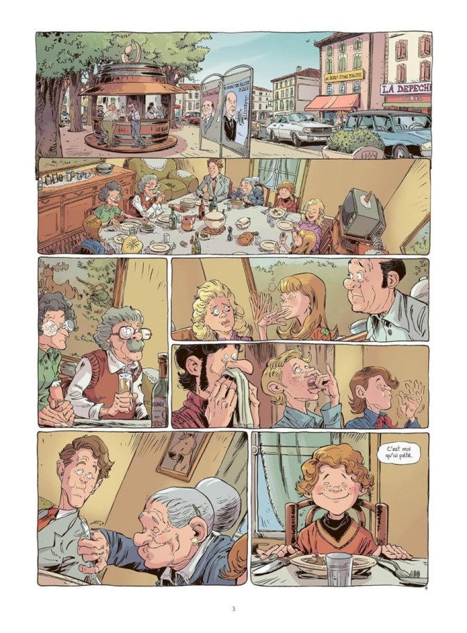La composition nous offre des gros plans sur les visages, nous rapprochant des personnages, ainsi que des plans de pied où leur dynamisme et leur énergie débordent presque de la case. Entre le cousin Pierre prêt à en découdre avec tous ou Pilou tout heureux qui gagne au jeu dominical, cette BD nous offre des personnages qui expriment physiquement leurs émotions, pour notre plus grand plaisir.