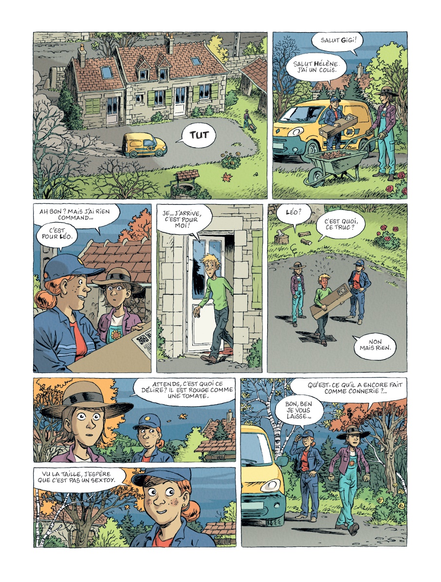 Résumé : L’album débute dans un petit village de campagne. Un jeune homme, Léo, reçoit un gros colis. Sa sœur Hélène s’interroge. Elle s’inquiète de ce petit frère qui court après un rêve, ne trouve pas de travail et vit au RSA chez elle depuis trop longtemps. Quand elle découvre le contenu du colis, une dispute éclate entre eux deux. Léo a trois mois pour sortir du RSA et trouver un travail !