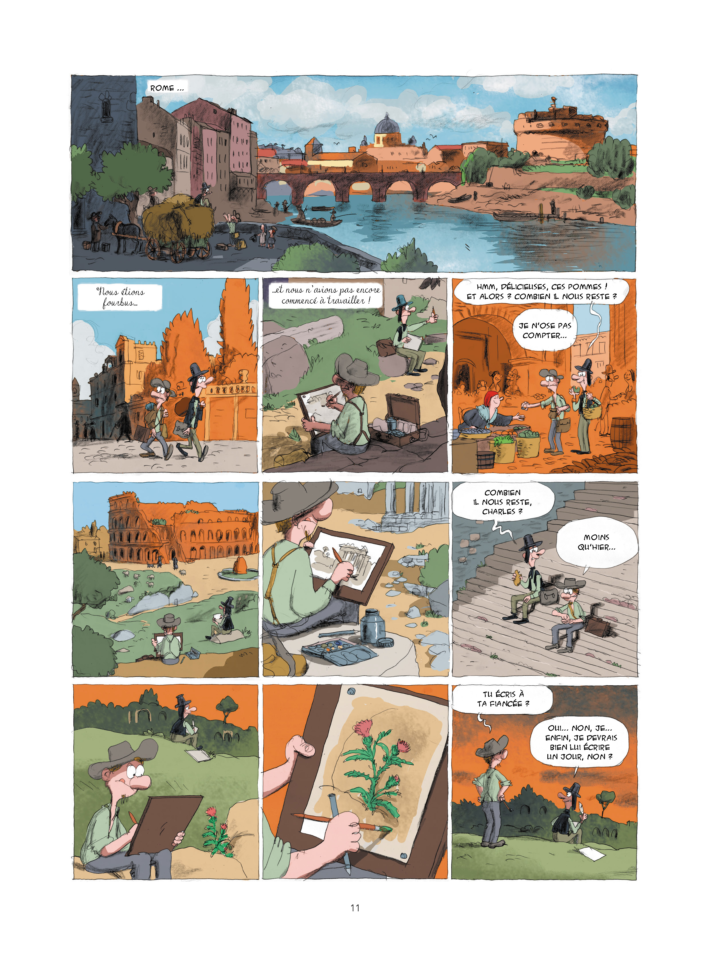 Bruno De Roover et Luc Cromheecke relatent l’existence de Charles-François Daubigny par des scènes courtes, simples et riches qui rendent bien compte de l’existence comme du travail du peintre. Il en résulte une bande dessinée drôle et touchante.