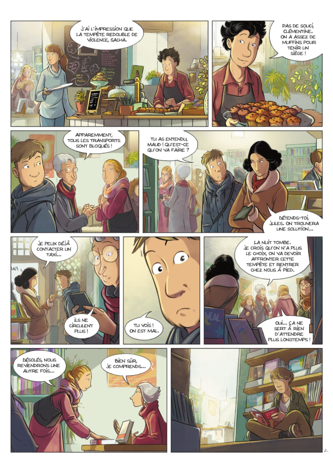 Le dessin de Marko et les couleurs de Maëla se marient excessivement bien et c’est avec plaisir que l’on retrouve les visages de Clémentine, Chantal et leurs comparses. L’ambiance nocturne, douce, de cette librairie amicale et chaleureuse, même au cœur de la tempête de neige, nous invite à nous poser pour profiter de cette atmosphère ouatée. La nuit bleutée, après la tempête, éclairée par les lampadaires de la ville, contraste avec le jour dru, sec où la neige frappe en bourrasques. Les couleurs de Maëla favorisent ces moments et renforcent leur impact émotionnel.