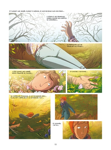 Marko et Maëla Cosson nous offrent des pages magnifiques de repos, d’observation de la nature. Une nature dessinée, mais vivante, où le soleil éclaire chaleureusement, où les feuilles tombent doucement, où l’automne pose ses couleurs oranges terreuses au fil des plantes et des bois. Cette BD prend encore plus le temps que les tomes précédents de se poser, de nous offrir une ambiance. Les citations ouvrant chaque histoire ouvrent également des portes. Ces ambiances graphiques nous plongent dans le monde de Clémentine. Et au bout d’un moment, on se rend compte que son monde est le notre. Ou du moins qu’ils sont suffisamment similaires pour que l’on s’y retrouve. Alors pourquoi ne pas aller en forêt et se créer nous aussi un moment d’abandon, d’observation, de pur sensation ? Et regarder le monde...
