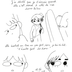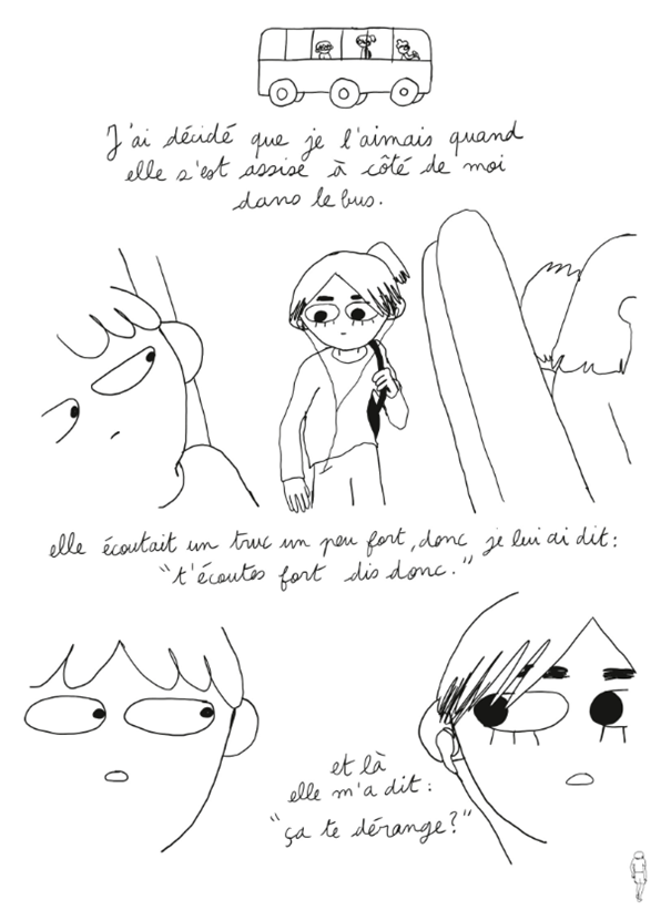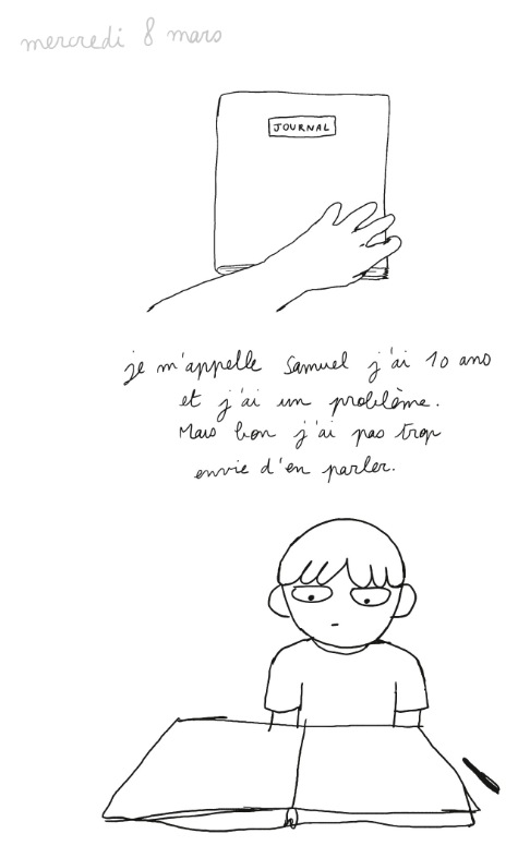 Minimaliste, le dessin s’inspire des plus grands, comme Sempé, pour former personnages, accessoires et décors sans que l’on soit perturbé par une absence de table ou un trait trop arrondi pour être une feuille. L’écriture y est d’ailleurs omniprésente, texte de chanson ou petit mot passé, une date mentionnée ou un extrait plus ou moins important du journal... Pourtant, dans ce vide et ce blanc, quelques éléments se détachent pour retenir toute l’attention : un mouvement du bassin pour une danse improvisée, un regard échangé lors d’une visite au musée, le reflet d’une vitre du bus... Autant de moments qui par leur extrême dénuement vont créer cette curieuse impression que les propres souvenirs du lecteur peuvent s’y raccrocher, chacun venant y greffer son vécu sur ces lignes noirs et ces fonds blancs, Samuel devenant universel, son journal celui de générations.