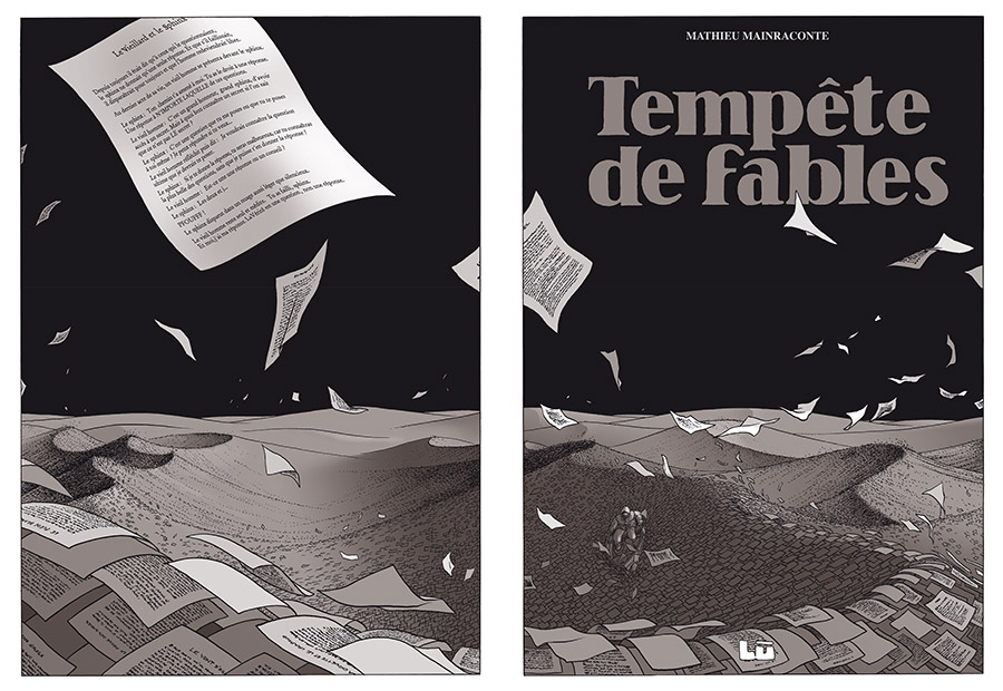 Imaginer les couvertures de livres qui n’existent pas, tel aura été le credo de Marc-Antoine Mathieu lorsqu’il a imaginé son Livre des livres. Avec en prime un résumé, un extrait ou une accroche pour enrober le tout, ces doubles pages se lisent comme un catalogue d’une exposition. Album ou objet artistique non identifié, le choix est difficile au moment d’aborder les pages, rigides dans leur apparence mais pleine de tourbillons dans ce qui est représenté. Pour citer quelques couvertures intrigantes, « la Géodale » et le « Temple de fables » sont particulièrement intéressantes, le « Bivouac de Morphée » avec son côté Damasio dans le texte laisse envisager une histoire passionnante... Autant de surprises qui plairont ou non, tout comme les faux résumés, voire suites d’œuvres fictives sont souvent pertinents et bien amenés. De même, quelques références se cachent, des calembours se glissent, dans les noms d’auteurs ou d’éditeurs, par exemple le « Livre de Koch ». Les influences de Kafka, d’Hitchcock ou de Borgès se reconnaissent dans certains cas, vagues scénarii envisagés ou promesses non tenues d’intrigues entrelacées.
