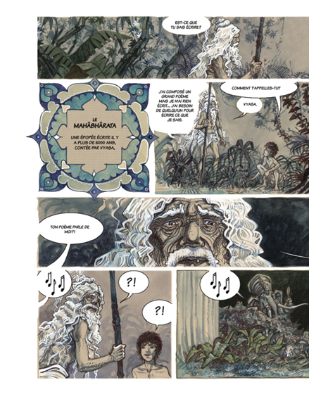 L’histoire racontée ici est complètement immersive, on est entraîné dans un flot majestueux à la suite des personnages. L’incroyable narration fonctionne à merveille. En effet, Le conteur Vyasa est lui-même lié à l’histoire et y prend part, ou est pris à parti par les héros de l’épopée. L’enfant qui l’écoute et pose des questions permet des aller-retours entre le conteur et le poème mais cela est trompeur, puisqu’ils font eux-mêmes partie de l’histoire qu’il raconte. L’association et la présence de Ganesha, le dieu à tête d’éléphant, qui note ce que raconte Vyasa indique que déjà le conteur a sa place dans les mythes des dieux, tout comme son conte.