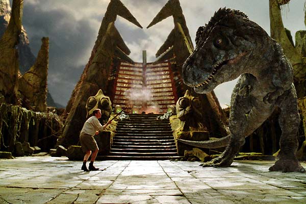 L’argument : Alors qu’ils naviguent sur une petite embarcation gonflable, un paléontologiste, son assistante et un guide sont emportés pendant un tremblement de terre dans une chute d’eau immense, vers une contrée oubliée de tous, où vivent dinosaures et insectes géants.