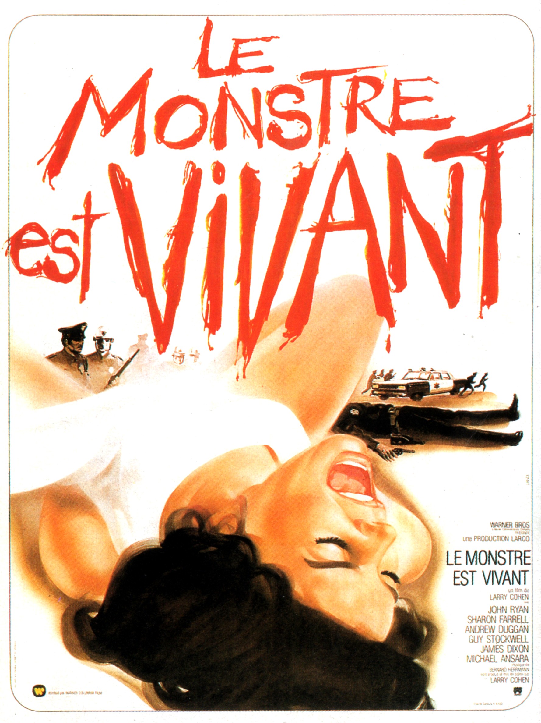 Critique : À l’instar de La nuit des morts vivants, Le monstre est vivant a révolutionné le cinéma d’horreur des années 60-70 : une intrigue minimaliste, la description d’un quotidien banal bouleversé par l’irruption d’une violence mystérieuse, l’alternance de séquences de suspense et de (rares) plans gore. C’est un cinéma qui fait la jonction entre la poésie horrifique d’un Jacques Tourneur et le fantastique extraverti des Dario Argento, John Carpenter et autres Wes Craven. Du premier courant, Larry Cohen retient l’art de susciter la peur sans filmer explicitement le personnage qui sème le trouble et le meurtre. Le bébé n’est montré que partiellement, une bande-son efficace laisse entendre ses cris terrifiants, et une caméra subjective (avec plans flous) nous identifie par intermittence au petit alien. De même que Jacques Tourneur ne filmait pas véritablement Simone Simon se transformer en panthère dans La Féline (1942), le cinéaste nous épargne les instants qui auraient pu paraître excessivement glauques (les assassinats après la rupture du cordon ombilical) : le plan d’un médecin sortant en sang du bloc opératoire est suffisamment suggestif. En même temps, Le monstre est vivant anticipe la vague du film d’horreur et de serial killer qui formera un genre en soi dans les décennies suivantes, de Halloween à Scream, avec ici une économie de moyens et d’effets spécifique à la série B, ainsi qu’une utilisation plus judicieuse des temps de repos pour mieux susciter l’oppression puis la surprise devant les séquences à nouveau horrifiques. Bien entendu, Larry Cohen connaît par cœur son petit Hitchcock illustré mais on ne s’en plaindra pas, tant on est ici dans le domaine de l’influence et de la référence plutôt que du plagiat. Outre les stridences musicales de Bernard Herrmann, compositeur attitré de Sir Alfred, on notera des correspondances manifestes avec Psychose : la vieille dame criminelle est remplacée par un bébé meurtrier, et plusieurs détails font écho à cette autre œuvre culte : la montée des marches de l’escalier dans l’appartement, les traces de la présence du corps dans le lit, et surtout la longue exposition trompeuse qui brouille les pistes et peut laisser songer à une chronique intimiste. À cet égard, l’american way of life se retrouve quelque peu malmené, l’enfant plus que sauvage étant ici un pavé dans la mare d’un certain conformisme familial. Le monstre est vivant fut l’objet de plusieurs suites d’une médiocrité indéniable, Cohen se contentant d’exploiter un filon.