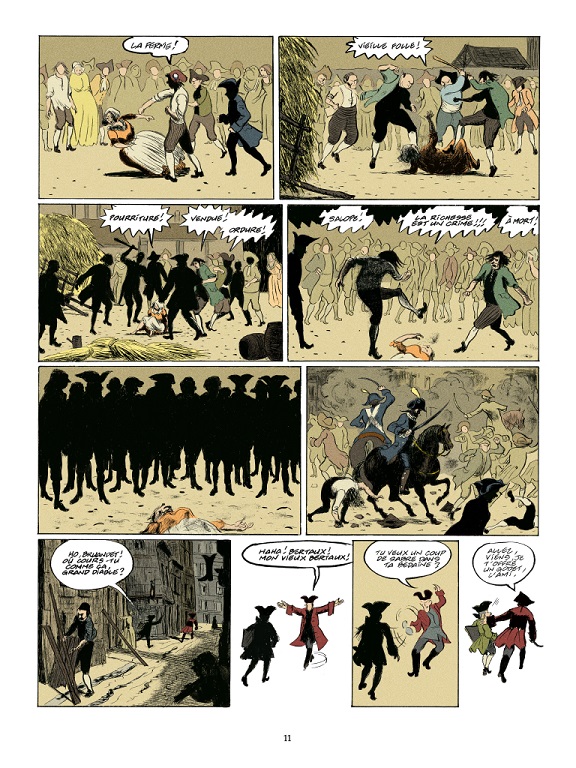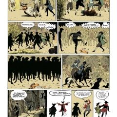 Produire une biographie n’est pas un acte aisé en bande dessinée. Pour ne pas tomber dans l’hagiographie moderne et assez insipide au niveau du style, les auteurs doivent redoubler d’efforts pour proposer une vision assez fidèle et un dessin qui s’accorde avec la vie et les passions du personnage décrit. Frantz Duchazeau a bien entendu potasser ses sources, pour nous accorder quelques esquisses de ce qui aurait pu être quelques mois dans la vie d’un peintre hors-la-loi. A l’écart des lois en effet, comme une bonne moitié d’un royaume qui est devenu trop vite république, il vivote, tranche puis se retranche, sans jamais s’arrêter de peindre ou de penser à la peinture. Les rencontres et les tableaux s’enchaînent, alors que gardes républicains, milices et gendarmes battent la campagne, alors que les ruines n’ont jamais été aussi belles et fraîches, rien ne semble avoir de début ou de fin, et très vite le côté biographie s’estompe, c’est une fiction qui se dresse devant le lecteur, parée d’atouts incroyables car artistiquement vrais. C’est une passion et une folie, celles d’un peintre en même temps que celles d’une époque, qui sont dessinées, peintes ici.