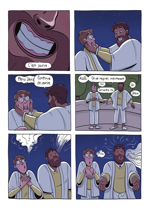 Au départ, le ton est léger comme une comédie à paillettes. Cependant, s’immiscent dans le récit des scènes où les situations se crispent, où les personnages serrent les dents, alors que les conventions sociales leur obligent à sourire sans cesse. On en apprend progressivement davantage sur la société dans laquelle évolue les personnages. Elle semble régie par des infrastructures numériques et par des individus cachés derrière des masques au trait minimaliste, mais tout sourire. Derrière ces sourires se cachent des réalités plus sombres. Les permis sont en fait des moyens de réguler la vie publique de cette société futuriste en s’immisçant dans la vie privée de ses membres. Ils sont des facteurs d’intégration, mais que se passe-t-il alors pour ceux qui échouent ? Tout en avançant dans le récit de Liz et Denis, les contours de cette société se dévoilent. Le bien-être est la vertu cardinale et il n’est pas admis de se sentir mal, hésitant ou discordant. Les membres qui ne parviennent pas à demeurer dans la positivité se voient pénalisés dans leur évolution sociale ou même carrément mis au ban. Au départ, le récit déborde de situations loufoques, mais au fil des pages elles deviennent de plus en plus grotesques, et avilissantes.