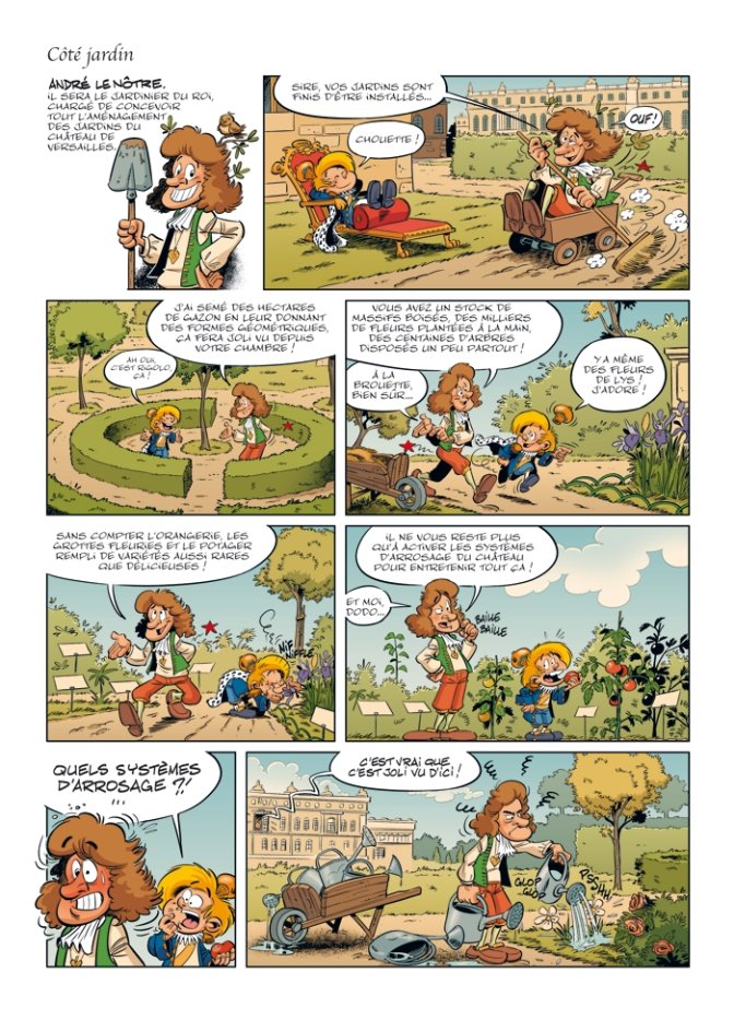 Des histoires courtes de quelques pages, alliés à des gags d’une page, voilà la recette de ce recueil. Cela permet de développer des petites intrigues et de les connecter avec des faits historiques. La principale source d’humour vient du parallèle qui est fait régulièrement ente la jeunesse et l’âge adulte du roi-soleil. On retrouve donc allègrement l’Edit de Nantes, Le Masque de Fer, l’éducation impitoyable d’Anne d’Autriche, la main de fer sur les caisses de l’état de Mazarin, les innovantes créations musicales de Lully. Tout cela passé au moule du regard enfantin de Louis XIV, sans doute bien moins mûr que ne l’était le véritable Roi-Soleil, mais tellement plus drôle.