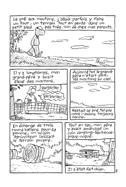 Résumé : Dans ce nouveau récit autobiographique de Tofépi, il est question d’un terrain familial sur lequel son grand-père élevait des moutons. Pour l’auteur, c’est un territoire de promenade, un lieu de pause et de découvertes étranges (une tortue), de nettoyage ou d’un essai de recherche d’eau avec une tige de noisetier. Au cœur de cet album, il y a le jour où, à trente-et-un an, sa mère a dit à Tofépi qu’il allait devoir quitter le domicile familial. Emménagement dans un petit appartement, vie solitaire, coexistence avec un chat et rebondissements éditoriaux s’ensuivent.