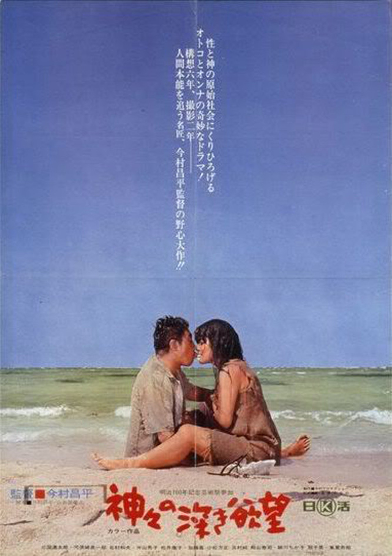 Résumé : Les habitants de l’ile de Kurage vivent selon les coutumes traditionnelles et croient toujours a la légende selon laquelle le dieu du frère et de la sœur créa leur île au milieu de la mer de Chine. "Profond Désir des dieux" raconte l’histoire de Nikichi qui aima sa sœur Uma. Il fut puni par son père qui l’enchaîna à un rocher. Les années passent, le frère et la sœur se retrouvent. Mais l’amant d’Uma, le chef de l’ile, est retrouvé mort. Les habitants, convaincus de la culpabilité de Nekichi, les tuent. Cinq ans plus tard, des touristes innocents envahissent l’île.
