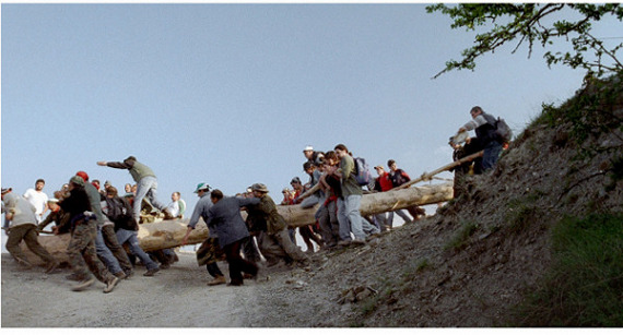 Dans sa méditation sur les cycles des saisons et de la vie, le film menace lui aussi d’être "trop" cyclique, enfermé dans ses propres artifices (ses postures rappellent d’ailleurs les tableaux burlesques, sur-composés, du cinéaste palestinien d’Elia Suleiman). Mais la réponse de Frammartino est déjà prête : chez lui, le "cycle" n’est pas seulement affaire de répétition du même, mais aussi de révolution de système. Il arrive parfois qu’un événement brise la ligne trop droite de cette Quattro volte, et c’est alors tout le film qui s’échappe de ses carcans, comme les chèvres de leur enclos : lors d’un plan-séquence central, morceau de bravoure mémorable et hilarant, un chien farceur provoque une mini-apocalypse au sein d’une fête populaire, sans s’en rendre compte, renversant ainsi toutes les valeurs précédemment établies. La caméra se met alors (significativement) en mouvement, composant un instant de grâce libre comme l’air, à la précision comique digne des meilleurs films muets (on pense notamment à Buster Keaton). C’est précisément à ce moment du "récit" qu’intervient la première transition cyclique, d’un état à un autre (de l’humain à l’animal) ; on comprend alors que la continuité du cycle se fait, aussi, au prix de plusieurs sauts de cycle. Pas d’harmonie sans renouvellement, nous dit-on ici, et Le Quattro volte n’a pas fini de nous ménager des surprises. De la même manière, les dernières minutes du film se déroulent dans un fumoir à bois, une fabrique de charbon, exactement comme en son début... sans qu’il soit possible de déterminer si ce sont, oui ou non, le "même" fumoir et le "même" bois.