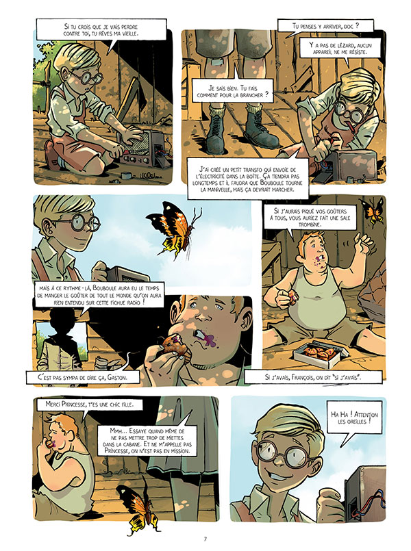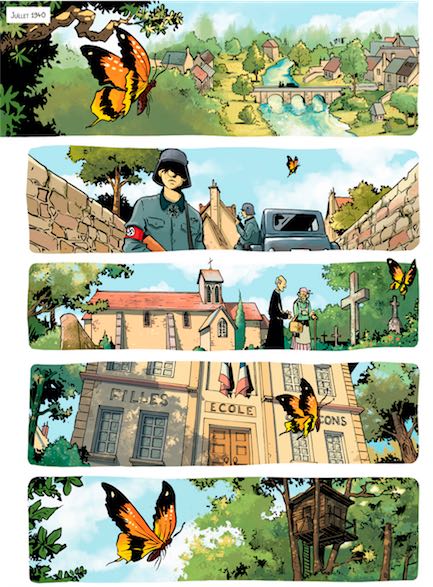 Ce premier tome du Réseau papillon (par Franck Dumanche au scénario et Nicolas Otéro au dessin) est une bonne surprise. Au lieu de traiter le sujet de la Seconde Guerre mondiale en passant par des axes vus et revus, l’album se concentre sur des points plus méconnus (le renseignement, la protection des œuvres d’art, le double jeu des personnes face à l’occupation, etc). Ici, pas de zone de guerre, de bombardement ou de déportation. Il s’agit plutôt de la vie rurale de 1940. Le sujet s’adresse plutôt à un public d’ados et de pré-ados qui auront l’occasion d’étudier le sujet dans leur programme de collège et lycée. Non content d’adopter un ton léger qui permet de s’imprégner de l’histoire et de ces quatre gamins débrouillards, cet album inspiré de faits et de personnages réels pourra aussi motiver des recherches sur le sujet.