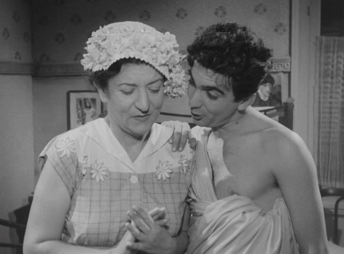 Mais c’est surtout grâce à la réalisation que l’intérêt ne s’effiloche pas ; Cacoyannis sait en effet utiliser des procédés qui revitalisent ce que l’intrigue pouvait avoir de convenu. Ainsi de ces conversations que le spectateur n’entend pas, ou de certains montages abrupts aptes à créer la surprise. Tout n’est néanmoins pas de cette eau : la scène où Alexis charme sa logeuse pour ne pas payer son loyer, nécessaire dramatiquement, ne dépasse pas le stéréotype. Quant au jeu des comédiens, il frôle la caricature dans des excès qui ne sont pas toujours du meilleur goût. N’empêche, la comédie est alerte, efficace et, si l’on ne rit pas souvent, on sourit plus qu’à son tour. On ne peut s’empêcher toutefois de noter un fond amer, surtout avec le personnage de l’avocat : si sa femme est à ce point désagréable et si le couple semble désuni, c’est qu’ils ont perdu la fille de douze ans ; la scène qui se conclut par un baiser entre lui et Mina sonne alors moins comme une scène de drague que comme une tentative vouée à l’échec. Mais comme on est avant tout dans une comédie, la femme pardonne, et Mina a redonné un peu de joie de vivre et d’espoir à un homme brisé. Après tout, et Molière l’a abondamment prouvé, les jeunes sont faits pour aller avec les jeunes …