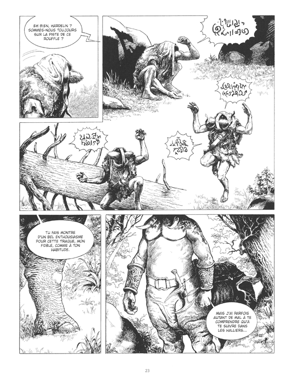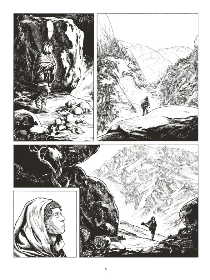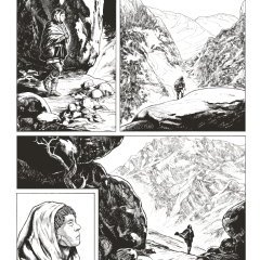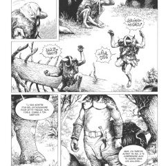 Le scénario, aussi puissant soit-il, ne serait rien sans un dessin lourdement armé. Ion Mud avait souligné la fragilité de la SF, tandis que Le Rite amène des épaules, une volonté sourde, émanant à la fois des personnages, du lieu, des tensions du passé. Ainsi, le héros est rapidement éclipsé par un centaure aux allures d’orque, chasseur aussi charismatique que son acolyte serviteur est énigmatique, qui impose un tempo lent à l’histoire. Le lac inerte de montagne pelée dénué de toute végétation donne essentiellement à voir de la pierre et du sang. Le surgissement du passé, qui se fait plus menaçant alors que les années s’éloignent, fait émerger une histoire sordide et ridicule à la fois, qui écrase toutes les forces en présence.