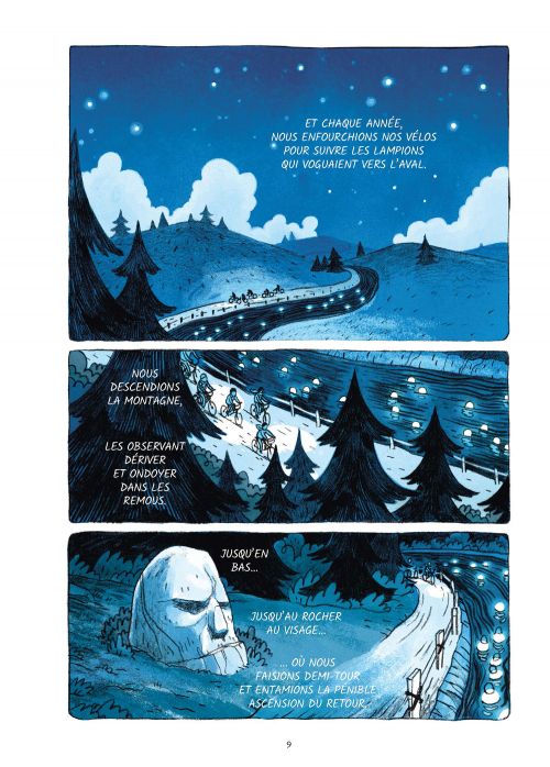 Résumé : Comme chaque année, Ben retrouve ses copains lors de la fête des lampions, et chacun s’accroche à son vélo pour suivre le courant la nuit tombée, sans regarder derrière. Celui qui ira le plus loin voudrait bien savoir jusqu’où vont ces lampions. Ben se retrouve finalement avec Nathaniel, le garçon bizarre que personne ne voulait dans le groupe, pour vivre des aventures fantastiques.
