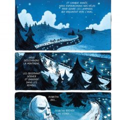 Le dessin n’est pas à proprement parlé au milieu des cultures comic et manga, puisqu’il semble appartenir largement à sa dimension d’origine, celle du continent américain. C’est dans les personnages secondaires, adjuvants ou opposants, que se décèle quelque fois cette petite influence de Miyazaki, une sorcière astronome aux yeux imposants par exemple... Pour le reste, les paysages assez sobres permettent une immersion assez universelle, chacun pouvant se retrouver plus ou moins dans cette rivière à remonter, jusqu’aux falaises imaginaires que toute montagne voudra bien abriter. Du reste, les tons changeants, du bleu étoilé vers la glaise au coin du feu, accompagnent les héros et le lecteur à travers un magnifique voyage au bout d’une jolie nuit.