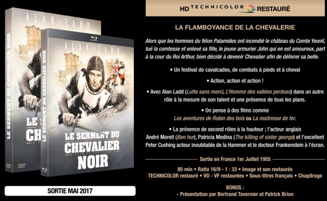 Les bandes-annonces de la collection et la galerie photos sont de tradition. Comme l’entretien avec Patrick Brion (9mn) qui défend mollement le film, arguant du plaisir du cinéma d’aventures et de trois curiosités. À quoi s’ajoute un documentaire sur Alan Ladd (57mn), très informé, qui multiplie les interventions et les extraits ; mais il faut passer sur l’habituelle et lassante hagiographie, comme sur l’importance accordée à la vie privée.