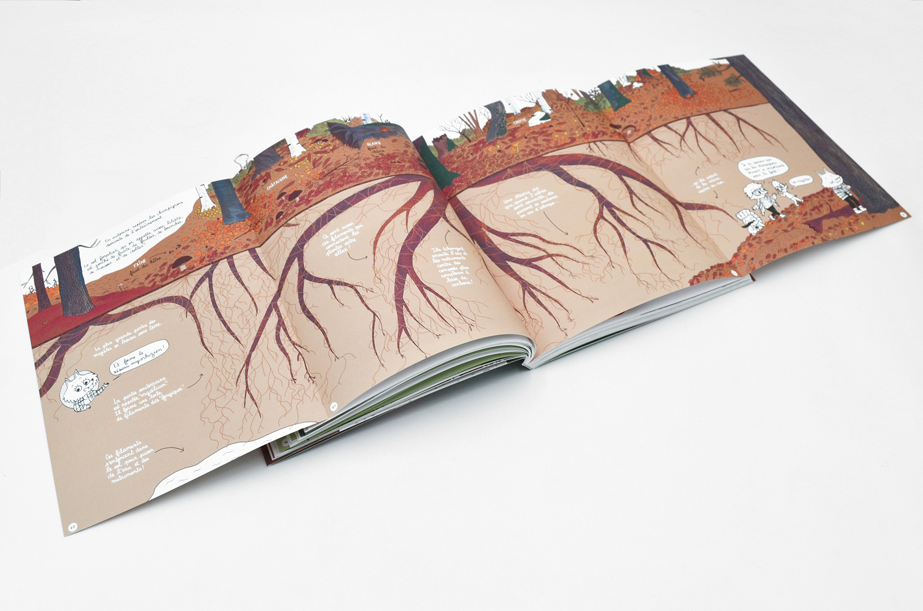 Dans cet album, comme dans ces précédents opus, Le Super Week-End de l’Espace et Le Super Week-End de l’Océan, l’autrice, Gaëlle Alméras, fait évoluer ses personnages, dessinés en noir et blanc, au travers des planches documentaires. Elle sait très bien conjuguer les codes graphiques de l’illustration et de la bande dessinée et offre ainsi un album très attrayant. Les planches sont joliment et harmonieusement colorées, la mise en page est très diversifiée et permet une lecture fluide. Découpé en vingt chapitres, l’album peut se lire facilement. Il contient cinq grands dépliants qui permettent par exemple de découvrir ce qui se déroule sous le sol des forêts.