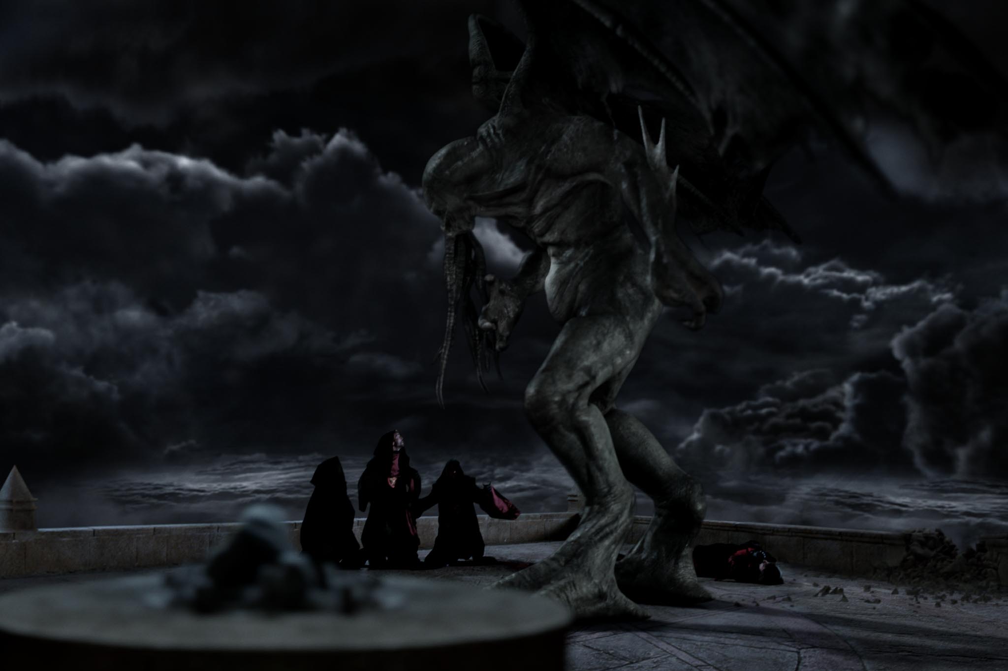 Pour palier cet évènement douloureux, ce dernier se tourne alors vers l’occulte et les secrets enfouis dans un certain Necronomicon. L’histoire qui broutait déjà sévère n’est toujours pas mieux lotie dès les premiers instants du Monde interdit. L’intrigue débute comme une espèce d’enquête ésotérique qui prend place de nos jours. Il va alors falloir s’armer de patience et subir une série de scènes et surtout de dialogues soporifiques qui épuisent le spectateurs pendant une bonne heure. Il se déroule sous nos yeux des faits pour le moins étranges sans qu’on puisse y trouver de véritables éléments de réponses (on relèvera que le personnage du fou qui indique la route au petit groupe menant l’enquête se distingue par son jeu tout bonnement exaspérant...). Lorsqu’on découvre enfin que tout est orchestré par une secte adoratrice de divinités anciennes, on remue un peu plus les paupières notamment lorsque l’imposant Cthulhu est invoqué puis surgit à l’occasion du sacrifice d’une 666ème victime (ça ne s’invente pas !) par le biais du Necronomicon. Le monstre en CGI (pas vraiment élaborés mais finalement correct comparé au budget du long métrage) après avoir passé une minute dans notre monde se verra pourtant renvoyé illico presto dans le sien avec une simple incantation (plutôt minable face à tout le cinéma mis en œuvre pour le faire apparaître...).