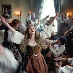 Ann Lee, en tant que femme et prophétesse, est marquée par la sexualité ou plutôt le dégout qu’elle ressent pour cette dernière. De l’enfance où elle voit ses parents en plein acte à l’âge adulte où les rapports avec son mari sont dépourvus de sensualité et entachés par le traumatisme de la perte de ses quatre nourrissons, Ann est blessée dans sa chair et rejette la jouissance sexuelle qui devient pour elle la raison de l’éloignement entre l’humanité et Dieu. Là où cela est une pratique radicale voire même austère de la religion, le film n’adopte jamais cette épure et trouve ses plus grandes scènes dans la célébration du corps. Toutes les scènes de tremblements sont mémorables, les longs mouvements circulaires de caméra laissent les transes fiévreuses se déployer devant nous, au point où l’on pourrait souhaiter se joindre à la farandole. Ici, l’abandon des plaisirs charnels n’est pas un abandon du corps, ce dernier est le réceptacle de l’Esprit Saint et permet de communiquer avec le très haut. Il s’agit de cette liberté de mouvement ainsi que leurs opinions égalitaires (les shakers croient en l’égalité entre les sexes, s’opposent à la guerre et à l’esclavage) qui poussent les autres croyants à les accueillir avec violence.