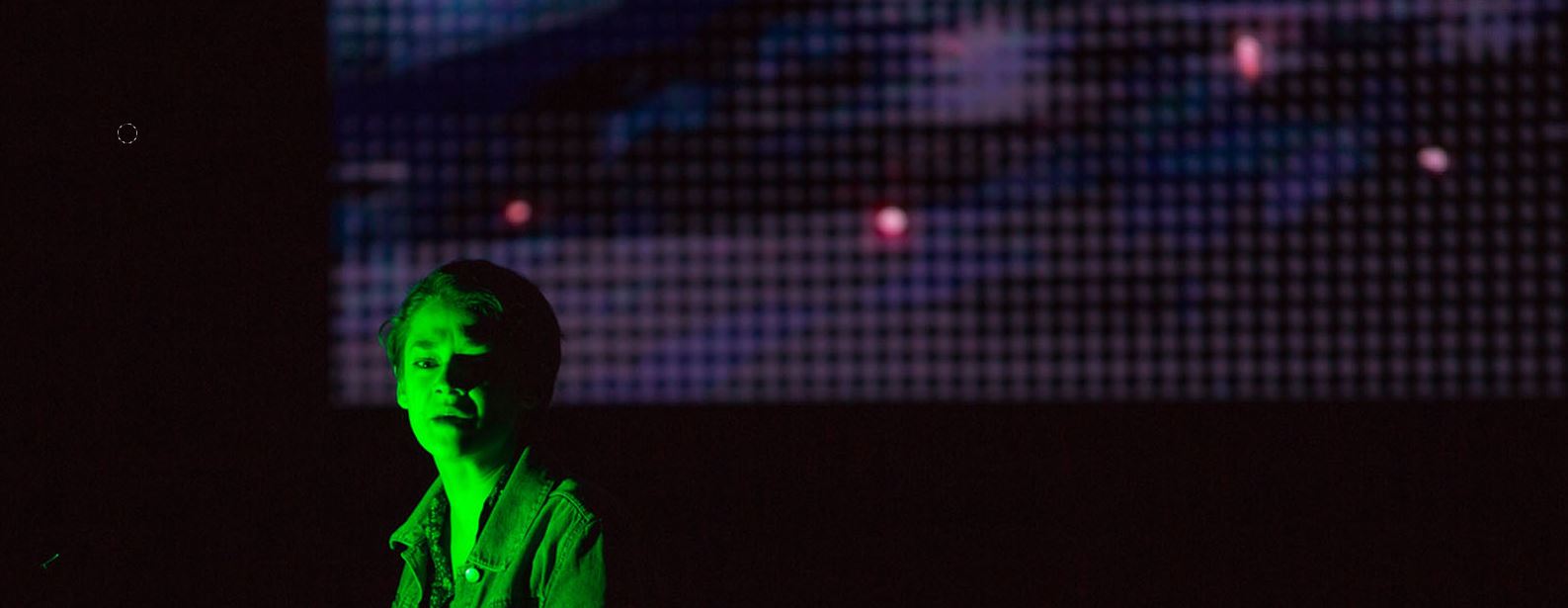 Une jeune femme en robe longue, assise sur une chaise haute de trois mètres semble léviter sur la scène entièrement noire. La comédienne enchaîne les prises de vues comme une actrice devant une caméra. Les prises sont nombreuses pour dire l’amour de ce messager anonyme qui va et qui vient et qui fait, par sa présence, la météo des beaux jours.