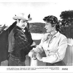 Difficile de prétendre qu’on tient un chef-d’œuvre oublié du western : Le trésor des collines rouges manque de rythme, se perd dans des intrigues périphériques et échoue à créer un véritable suspense. Ses acteurs ne sont pas de premier plan, même s’ils mettent beaucoup d’énergie à défendre leurs personnages. Mais il y a un petit plaisir à découvrir un exemple de ces films inconnus chez nous, réalisés à la va-vite et sans prétention, ces fameuses « série B » à l’esthétique bâclée et qui, de temps en temps surprennent par des incongruités.