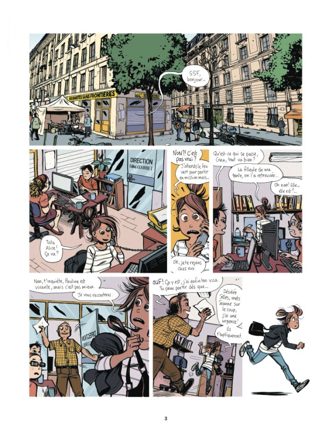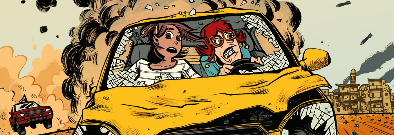 Quand Gina apprend que sa cousine Pauline a rejoint les terroristes et la Syrakie, elle se dit qu’une mission de sauvetage s’impose. Sa tante Alice en fera de même pour la sortir de ce bourbier, pour permettre que tout le monde s’en sorte vivant... Parodier l’État islamique et l’embrigadement des djihadistes n’est pas un sujet facile, et il faut un petit moment pour vraiment se rendre compte que l’on peut rire de cette histoire. En effet, les scènes basculent très vite dans ce pays imaginaire (mélange d’Irak et Syrie, qui sonne pourtant comme la Chiraquie...) qui reprend toutefois de nombreux aspects de la vie réelle. Les conditions d’enfermement des femmes, la vie quotidienne des hommes, tout cela s’appuie sur des témoignages d’anciens prisonniers et repentis. Alors évidemment, dans cet album jeunesse, la vérité est édulcorée. Les gags sont nombreux, surtout lorsqu’une femme se travestit pour se faire passer pour la cuisinier du groupe. En fait, la tante est le vrai ressort comique de toute l’histoire, tandis que les jeunes filles apportent plutôt le côté sérieux, voire la tension dramatique. Même si une fin heureuse semble obligatoire, il y a des sacrifices et du danger, des morts et du sang sur la route de la liberté. Ce que l’on pourrait seulement reprocher à ce livre, c’est de banaliser une situation horrible, de ne peut-être pas assez prévenir sur l’horreur de la radicalisation de certains jeunes.