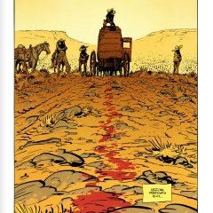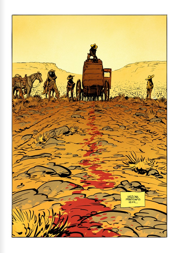 Les planches alternent entre des compositions serrées, dialoguées et d’autres plus aérées, laissant place à l’action ou simplement à la tension. Comme cette planche d’ouverture qui n’augure rien de bon, au vu de cette traînée de sang qui mène à une diligence immobile.