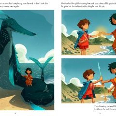 Lorsque l’on dit que l’album se lit comme un conte, ce n’est pas seulement à cause de son message plein d’optimisme et d’empathie. C’est aussi parce qu’avec ses cases immenses, son absence de dialogue en bulles et ses longues phrases écrites en haut et en bas des planches, il y a un retour aux sources, comme un livre d’histoire que l’on pourrait raconter, ou qu’un enfant pourrait se raconter, encouragé par des dessins élégants et imposants. L’ensemble est visuellement parfait pour les plus petits, et les grands pourront le leur raconter avec bonheur, cherchant les petits détails qui font la beauté de ces grandes pages.